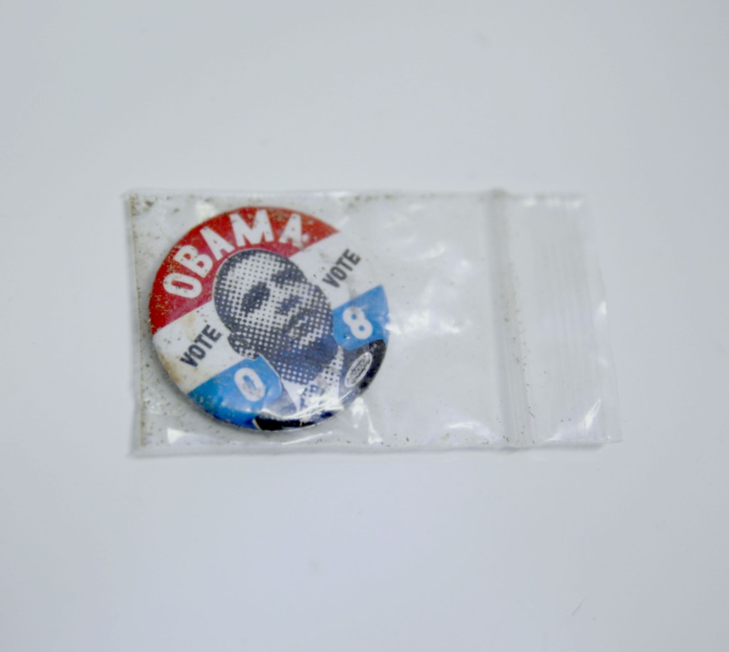 “hussein”, 2014: ‘08 campaign button, “dime bag” with residue