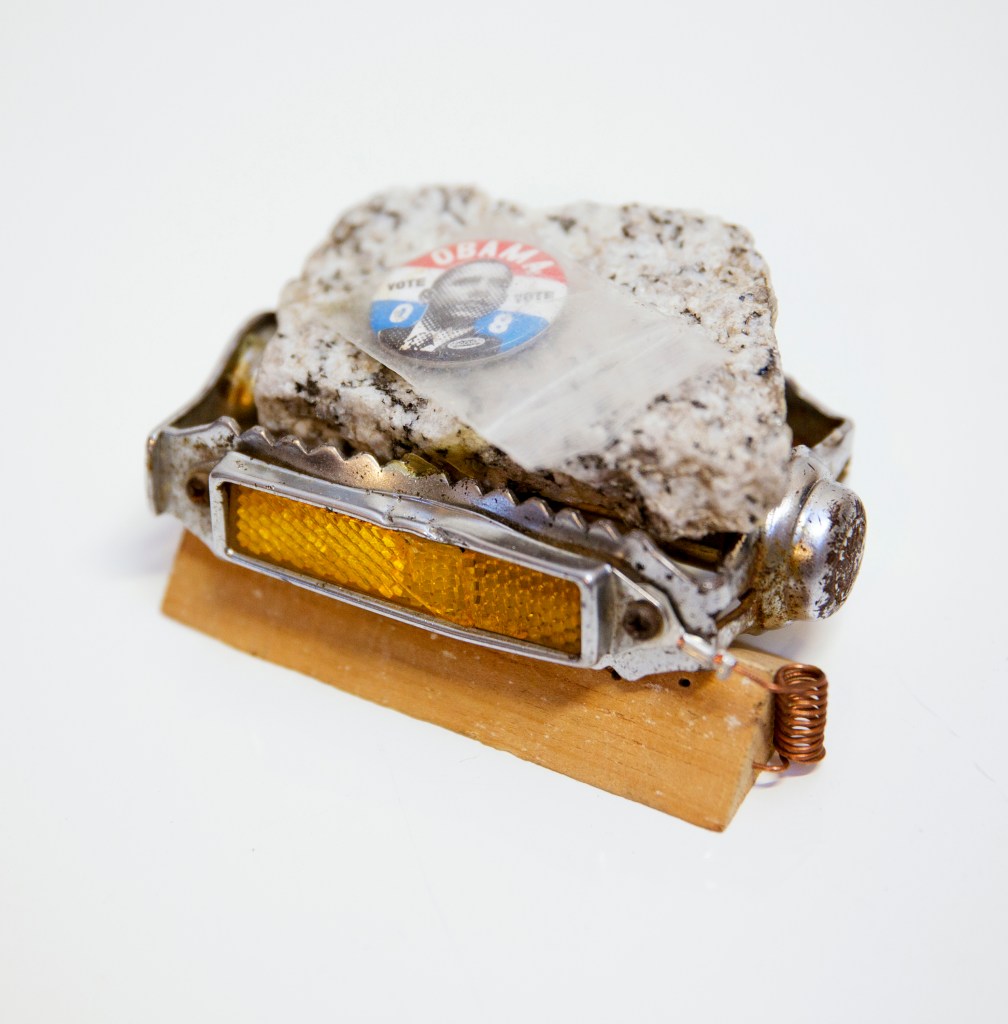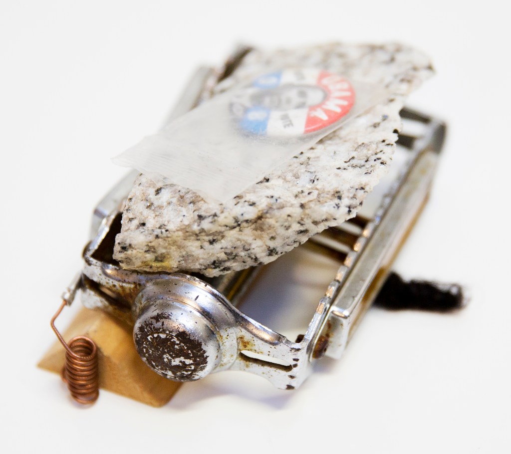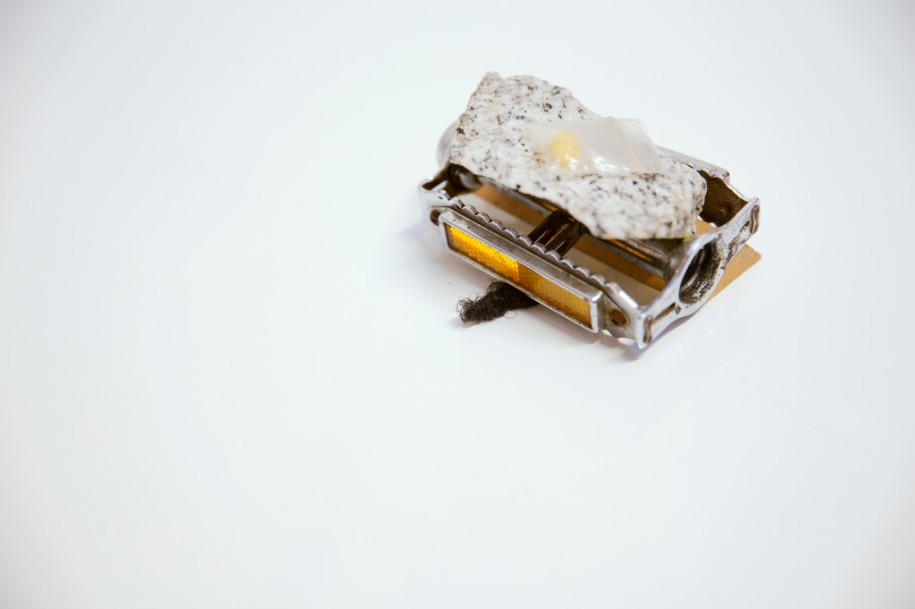 “untitled (trap 1)” 2013: broken granite curb on ruined pedal with pine wedge, hair,and copper ‘spring’