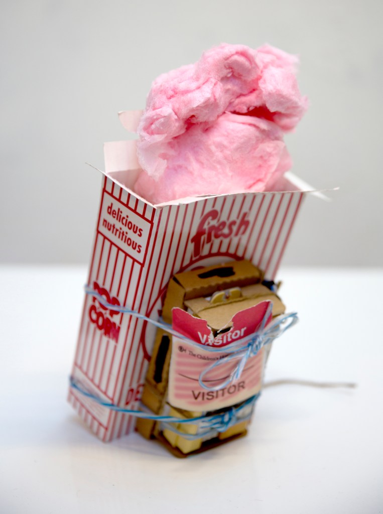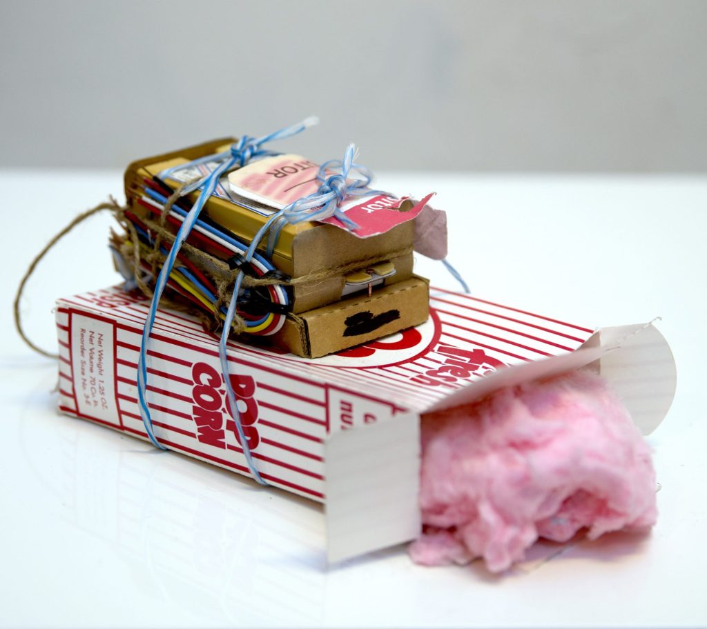 “as regards audience (a)”, 2013: popcorn box, construction twine, transformer, cotton candy, upholstery tacks