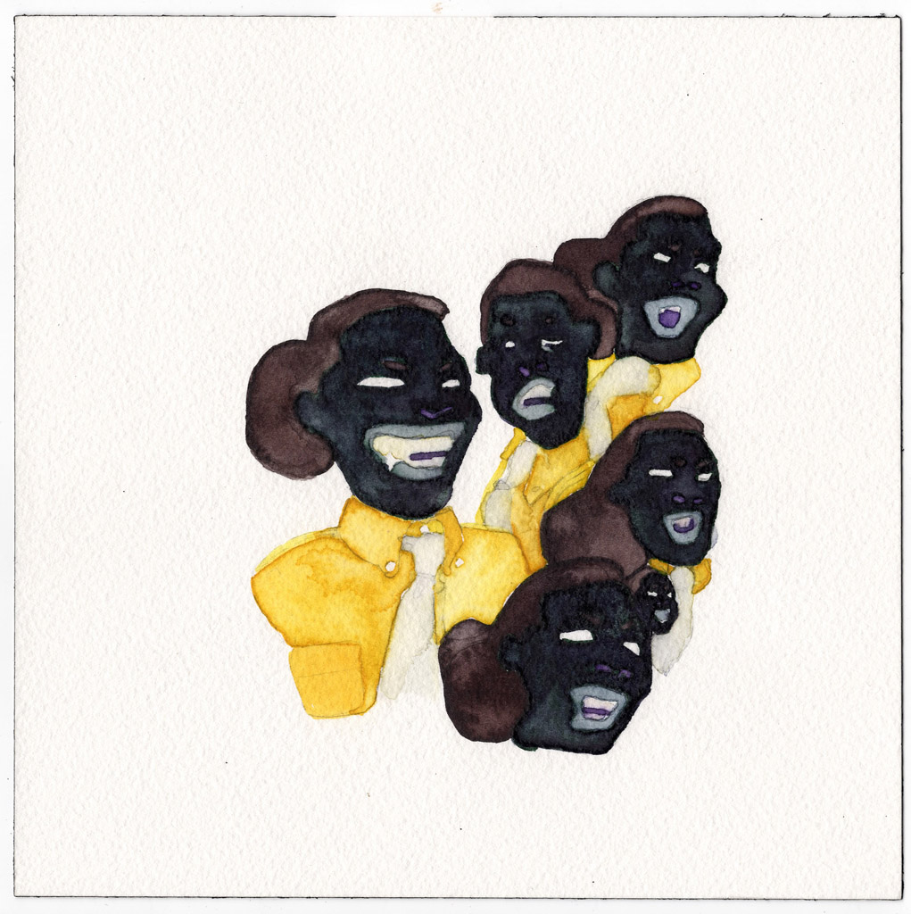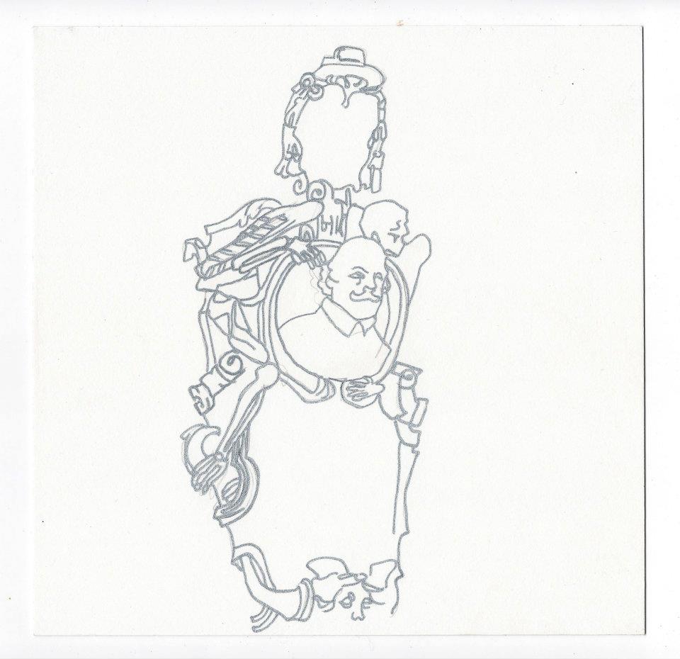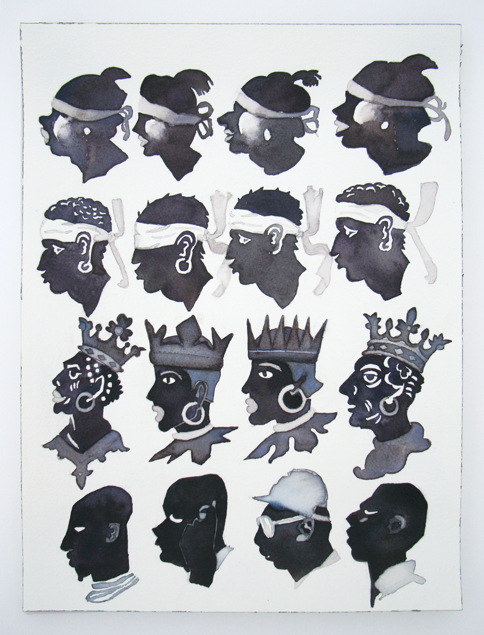 Vatican City, (my representative work) considers variations on a theme. Each row marks an encounter with different forms of the same symbol. The first row are maure I found and sketched at the Vatican museum. The second row are Sos Bator Moros, or Four Moors of the Sardinian flag. The third row are transformations of the Moor of Freising, heraldic charge of the current pope. The final row are Senegalese bag sellers whose likenesses I have captured. I was thinking of old botanical lithographs and Phrenology.